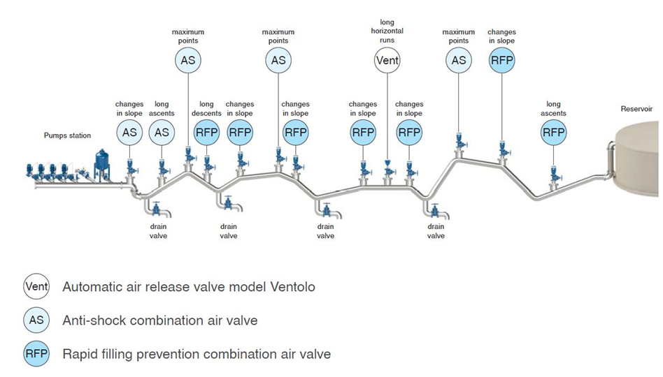 In the figure below you will find the most important locations for air valves on the pipeline with different functions :
